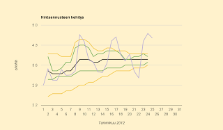 Sähkön hinta on teki nyt selvän pesäeron viimeiseen kahteen viikkoon, joina perjantain hinta on ollut viikon alin. Nyt perjantain hinta on kuukauden korkein. Syynä lienevät selvästi viilenneet säät. Jos hinta jää nykyiselle tasolleen, kuukauden keskihinta nousee ennusteesta 3,8 c/kWh tasolle 3,9 c/kWh. Ennuste kuitenkin on yhä tasolla 3,8 c/kWh (mutta tarkemmin hyvin lähellä 3,85 c/kWh), koska useimmat mittarit odottavat, että hinta palaa viikonlopuksi lähelle kuukauden keskiarvoa.