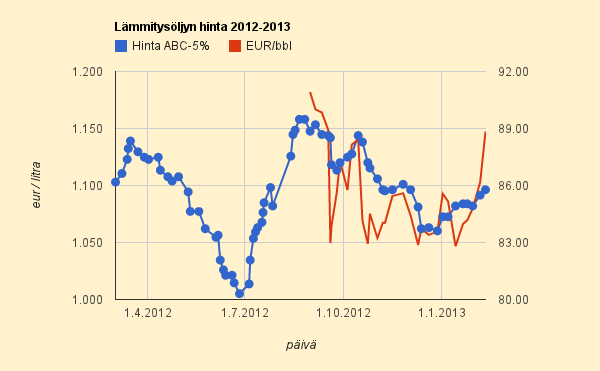 Syynä nousuun on yhtäaikainen euron hinnan putoaminen ja öljyn dollarihinnan nousu. Yleensä nämä ovat menneet samaan suuntaan ja kompensoineet toisensa. Nyt nousu on ollut nopea: kolmessa viikossa 7,1%.