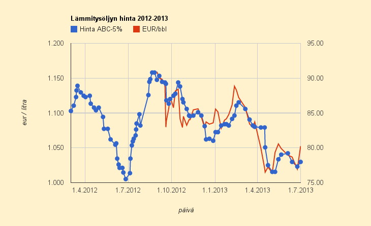 Lämmitysöljyn vertailuhintana käytetty HOK-Elanto-ABC-5% nousi maanantai-iltana. Hinta on poikkeuksellisesti noususta huolimatta kohtuullinen, indeksi litra lämmitysöljyä / litra brent-öljyä on 2,15., mikä on noin viimeisen vuoden keskiarvo.