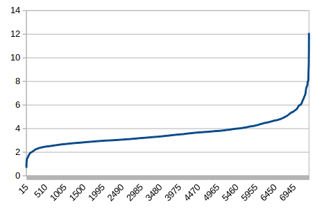 Alle kahden sentin tunteja oli 25. Tästä noustiin nopeasti, sillä kahdella alkavia tunteja oli 533 eli 7% kaikista tunneista.