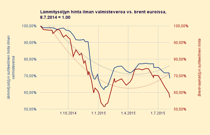 6.8.2015: lämmitysöljy 83 c/litra, raakaöljy 45 euroa/tynnyri