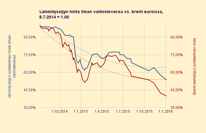 Toinen tapa nähdä asia on, että suhteessa raakaöljyn eurohinnan ja verottoman lämmitysöljyn hinnan pitäisi laskea täsmälleen yhtä paljon. Näin ei kuitenkaan ole. Raakaöljyn eurohinta on pudonnut miltei kolmannekseen kesästä 2014, mutta lämmitysöljyn veroton hinta on pudonnut vain puoleen.
