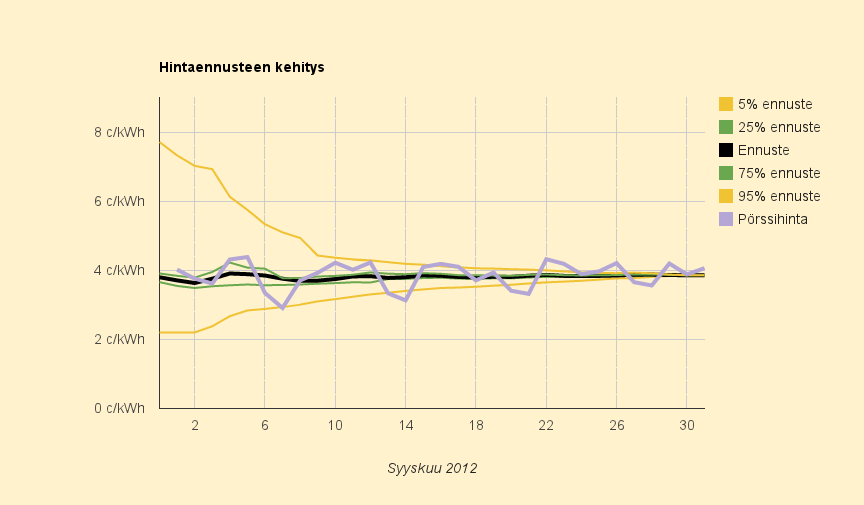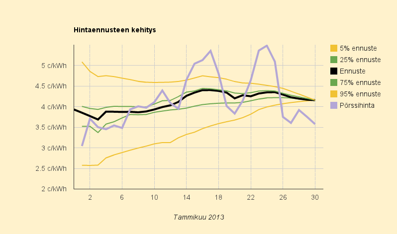 Lopullinen hinta oli jokaisen kuukauden päivän ennusteen 50% ja 90% ennustehaarukan sisäpuolella.