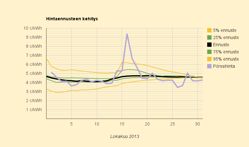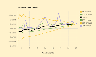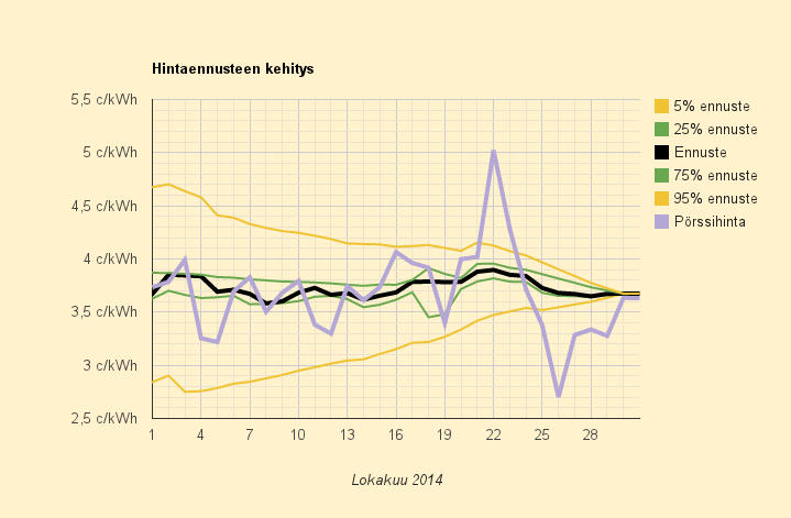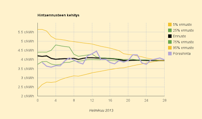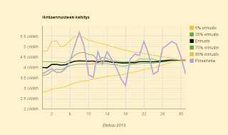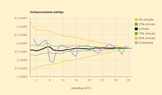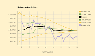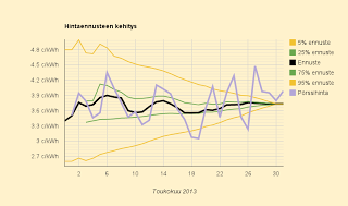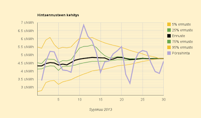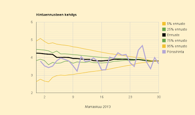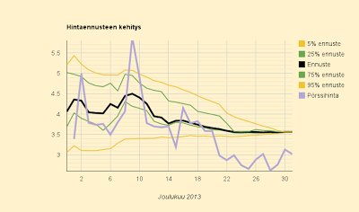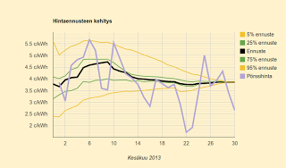 Ennuste oli aivan viimeiseen asti lähes viisi prosenttia väärässä, koska 29. päivä oli ennenkuulumattoman kallis. Sen sijaan kuukauden alussa ennuste oli kolmena päivänä prosentin tarkkuudella oikein.