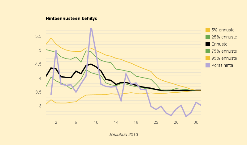 Lopullinen hinta ei ollut ennusteen 90% vaihteluvälin sisällä viitenä päivänä.
