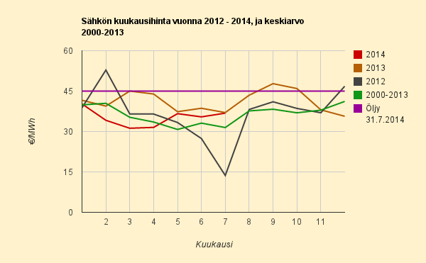 Hinta 0,1 c/kWh korkeampi kuin vuonna 2013