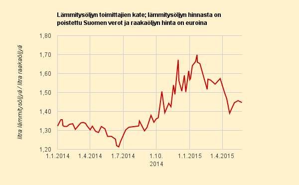Lopuksi toimittajien katteen kehittyminen: kuinka monta litraa raakaöljyä saa yhden Suomessa myytävän lämmitysöljylitran verottomalla hinnalla: