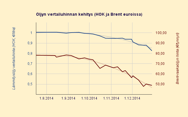 Nyt kun öljyn hinta on laskenut rajusti ja lämmitysöljyn vero nousi kolme senttiä eli nykyhinnalla nelisen prosenttia, kuva ei enää kerro selvästi, mihin nousseen katekäyrän pitäisi palata.