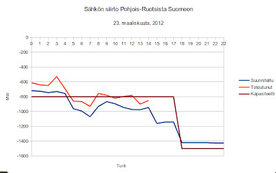 Saksan sähkön hinnan luulisi olevat melko erilainen kuin Suomen sähkön hinnan. Näin ei kuitenkaan ainakaan tänään sunnuntaina 25.3.2012 ole. Puolet vuorokaudesta sähkön hinta on käytännössä sama Suomessa ja Saksassa.
